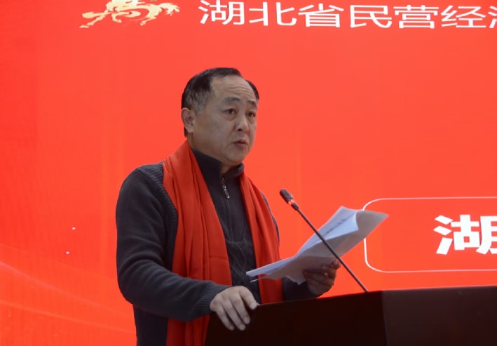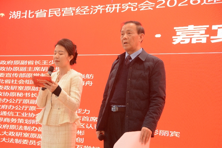 本次团拜会规格之高,体现了社会各界对民营经济的高度重视。湖北省社会组织总会会长崔海舟、湖北省人民政府原副省长王少阶、省政协原副主席胡永继莅临现场,省委办公厅、省委宣传部、省委政研室、省政府办公厅、省政府法制办,省人大常委会政研室、法制委员会,省政协办公厅、省公安厅、省商务厅、省安全厅、省司法厅、省市场监督管理局、省档案局、省公共资源交易管理局、省武警总队政治部、武汉铁路局等有关单位的老领导,各有关专家、教授、学者、商协会会长与来自政、商、学、研各界及新闻媒体代表近300人齐聚一堂,共话民营经济发展成就,共绘2026年高质量发展蓝图。 本次迎新年团拜会特别鸣谢来自全省的民营企业家们的赞助支持,他们是:湖北匠心荟实业集团有限公司、李时珍药业集团公司、芯中汉数智集团有限公司、湖北华圣康生物科技有限公司、武汉市波塞冬商贸有限公司、尼雕(湖北)网络科技集团有限公司、湖北协禾医疗科技集团有限公司、湖北土老憨生态农业集团有限公司、瞎飞数字科技武汉有限责任公司、湖北玉皇尖农业开发有限公司、湖北协禾医疗科技集团有限公司、湖北悦泉云川饮品有限公司、武汉三三数字科技公司、九州长江宏图新能源科技(四川)有限公司、武汉睿楚悦家商贸公司、湖北果源康生物科技有限公司、立早茶业(湖北)有限公司、天香古桂子(咸宁)健康科技有限公司、湖北皓远天恒建设工程有限公司、华发集团·外滩玺置业、武汉歉盛控股集团有限公司、武汉同心商贸有限公司、湖北锦程数字城市技术有限公司、北京中建科工程咨询有限公司、湖北敬卓律师事务所、湖北省书画协会冠雅书院、湖北酒缘电子商务有限公司、湖北奥星有限公司、武汉云端鸿开商贸有限公司、武汉德善行文化有限公司、 年会在庄严的国歌声中正式开始。研究会会长徐春林在致辞中回顾了过去一年研究会紧扣省委省政府中心工作,在政策宣导、企业服务、资源对接等方面取得的积极成效。党组书记王根法则系统总结了2025年度工作,明确了新一年聚焦科技创新、产业升级、绿色发展的服务方向。湖北省社会组织总会会长崔海舟在讲话中赞扬了研究会作为重要枢纽型组织所发挥的积极作用。